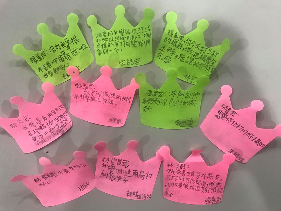 環節之一的「稱讚」課程,不少孩子都大方寫下對隊友的稱讚,但是仔細觀察內容,卻不難發現小將們對於打擊好、守備強的隊友特別關注,但經老師提醒後,台東新生國小的一名孩子發現了團隊合作不僅是球技而已,他對另一名孩童說:「你是隊長,有管好隊員,雖然打得不是很好,但是你打得很認真。」