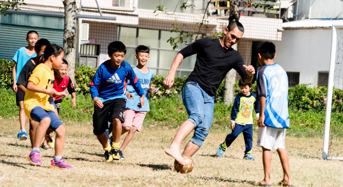 上午進行踢足球活動,張志豪看著幾位小孩穿著拖鞋,好奇怎麼沒有穿球鞋,「我們沒有。」他想了想:「那我也不穿鞋了,你們要教我踢球喔,我是第一次!」完全沒有架子,張志豪就這樣打著赤腳,與孩子們盡情在場上奔跑,臉上充滿笑容:「真的很謝謝你們教我踢球。」
