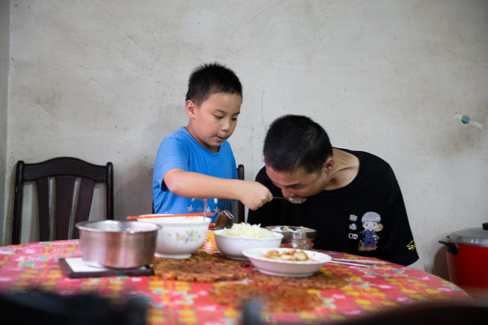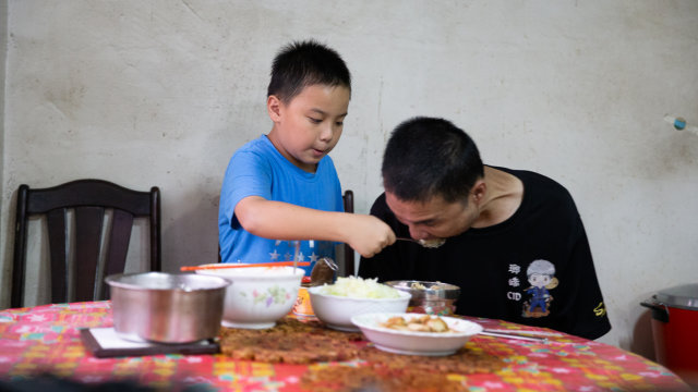 ▲阿泰除了要幫爸爸洗澡,還得餵爸爸吃飯與照顧起居,有時候小小年紀的他也會覺得累...。