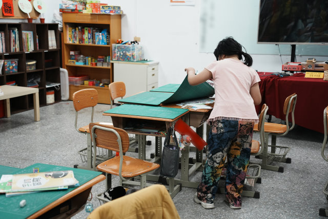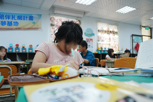 ▲小璇剛到基地時,總是無法寫完作業,在志工耐心與她磨合下,現在進步許多。