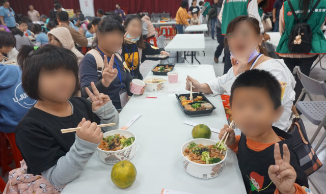 ▲小璇(左三)最喜歡「臺灣夢」基地的晚餐,總是喊「再來一碗!」好幾次。