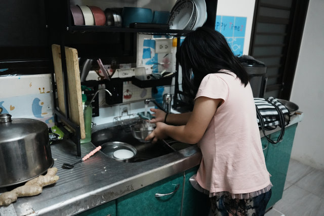 ▲小璇在家會洗碗,用簡單的方式幫媽媽分擔家務。