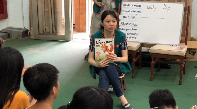 「Listen to me carefully!」第二次上課,面對鬧哄哄的教室,Sharon以堅定的語氣下了第一道指令。小朋友們紛紛停下動作看著台上的二位志工,接著,美語志工帶著小朋友們用英文唸出一條條教室規則,約定不遵守的時候就會扣團隊分數,接下來的50分鐘,大小朋友都能很乖乖地享受美語故事時間。