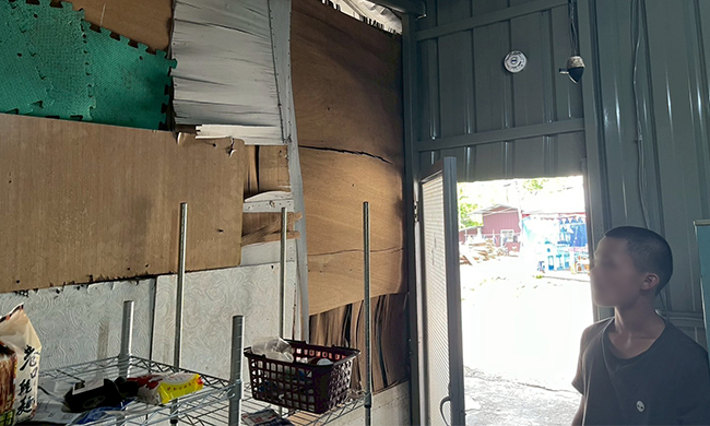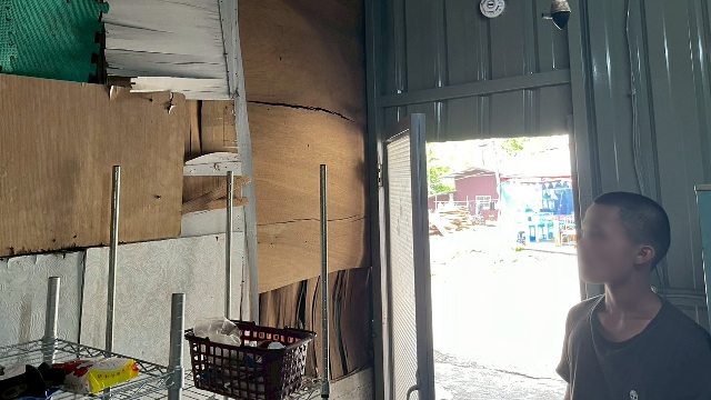 ▲阿嘉住在破舊的貨櫃屋裡,牆面是木片、巧拼勉強拼湊起來的,每到冬天寒風刺骨,夏天特別悶熱。