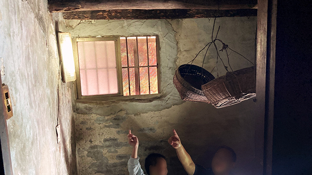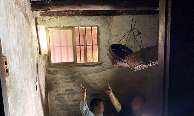 ▲「點燃生命之火」志工與里長家訪時,手拿探照燈一看,驚覺小豆一家住的老舊平房,屋頂梁柱被蛀蝕,也有部分已經塌陷,居住安危令人擔憂。
