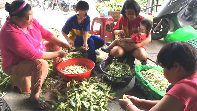 ▲家門前的空地偶爾會看到祖孫總動員做些手工活,這次是剝皇帝豆,也算是幫忙賺點家用貼補給收留佑佑一家子的阿嬤。