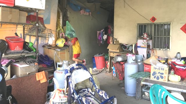 ▲舅舅的豬寮改建的「家」只有簡單搭蓋用來睡覺的兩個小房間,多餘的雜物就只能往家門口堆積。